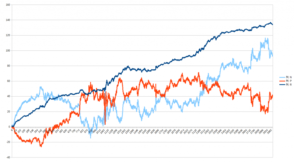 赤が日経225の損益、水色がドル円の損益、紫が合計
